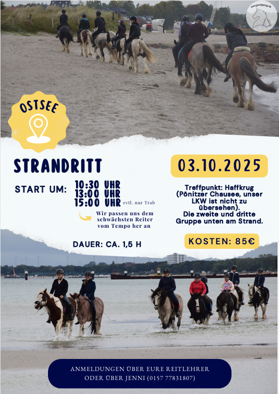 Von Anfang Oktober bis Ende März bieten wir alle 4 Wochen Ausritte am Timmendorfer Strand an, die etwa 90 Minuten dauern.